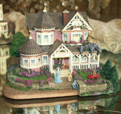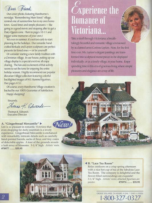 Welcome to Victoriana's Gingerbread Mercantile & The Toy Shoppe. Actually Dove Chapel was next, but I have decided to save that for the Last Page of Victoriana, As we Celebrate Charles Coleridge & Felicity Bronson's Wedding, For more information, click the other Victoriana Pages at the top of the Page, May Cottage will give you the Beginning of the Concept, & Story, The next two Pages of Victoriana, will familiarize you with the Story of how this all came to be in the 90's, for Hawthorne Architectural Structures, a division of Bradford Exchange. It was during the middle of their development, that I had relocated to Arizona, after my Divorce from the 747 Captain, Bill. So it is also why the storyline didn't continue. As you can imagine life became quite Traumatic. I had Brunette Hair for about 5 yrs. back then. One of the articles I share in this is from the Last Collectible show in Rosemont Illinois, I drove from Sedona where I was living at the time, with everything to set up the show, in my horse trailer, I had one friend to attend the Awards Banquet with, We had been friends since second Grade, so it was a special blessing to share lifelong dreams we had since childhood, now being fulfilled in our lives. I won the single booth award, so that was really special. I chose the lilac background for these two cottages, for my love and missing of Lilacs here in Arizona. Blessings to you, Thankyou for Visiting Victoriana once again! Corinne Layton